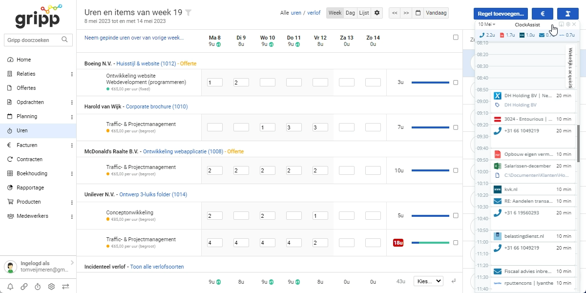 Within Gripp, ClockAssist shows you exactly how you spent your working day. The ideal reminder to base your timesheets on.